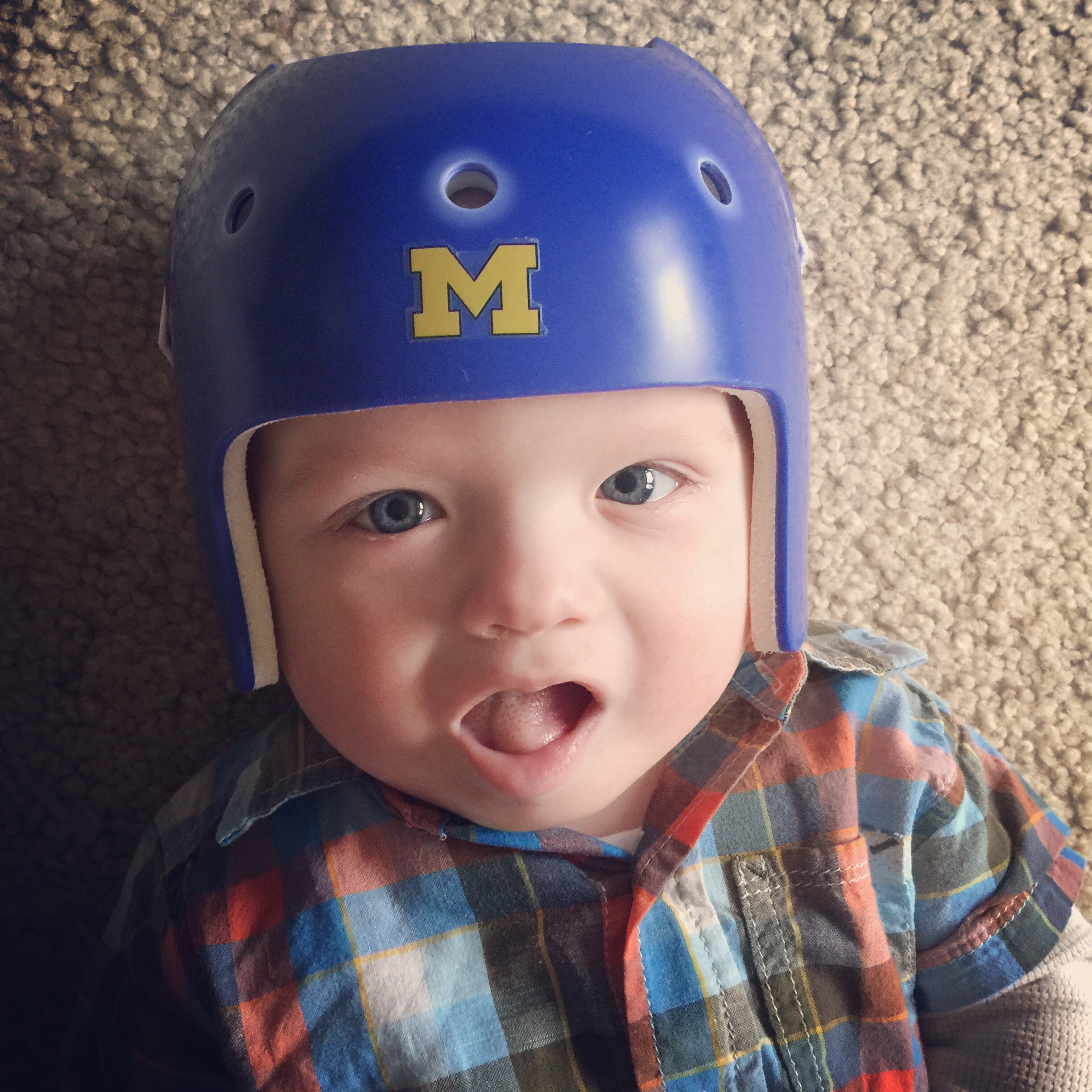 We continued weekly therapy visits from that point forward; we are still in PT today but with a different therapist (more on that later). We went on March 23rd to be fitted for a helmet and he received that helmet on April 6th. The helmet was to be worn 24/7. The only exception was bath time.