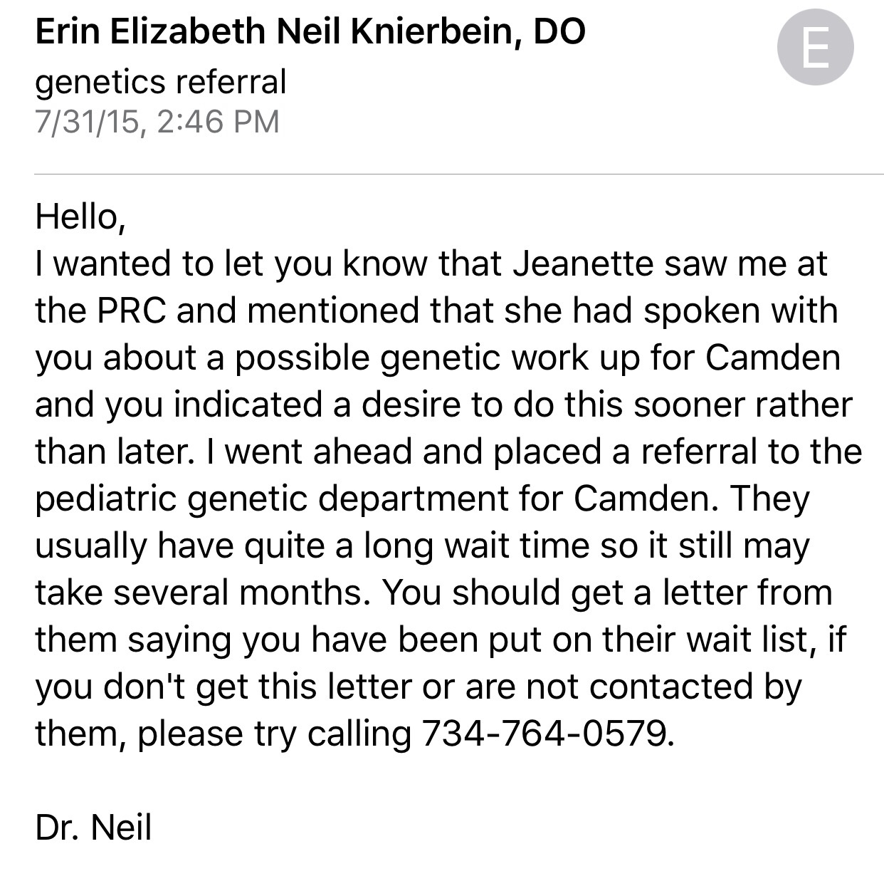 From this point forward his medical team has referred to him as a ‘medical mystery’. They have never stopped searching for answers but everything comes up ‘normal’, which we are extremely grateful for although it would be nice to know what is causing this delayed development. We did have a lot of direct and indirect (through his therapists) contact with Dr. Neil in those 6 months between appointments. After me doing a lot of research and a mention from Dr. Neil at his appointment I thought it would be good to go down the genetic route sooner than later.